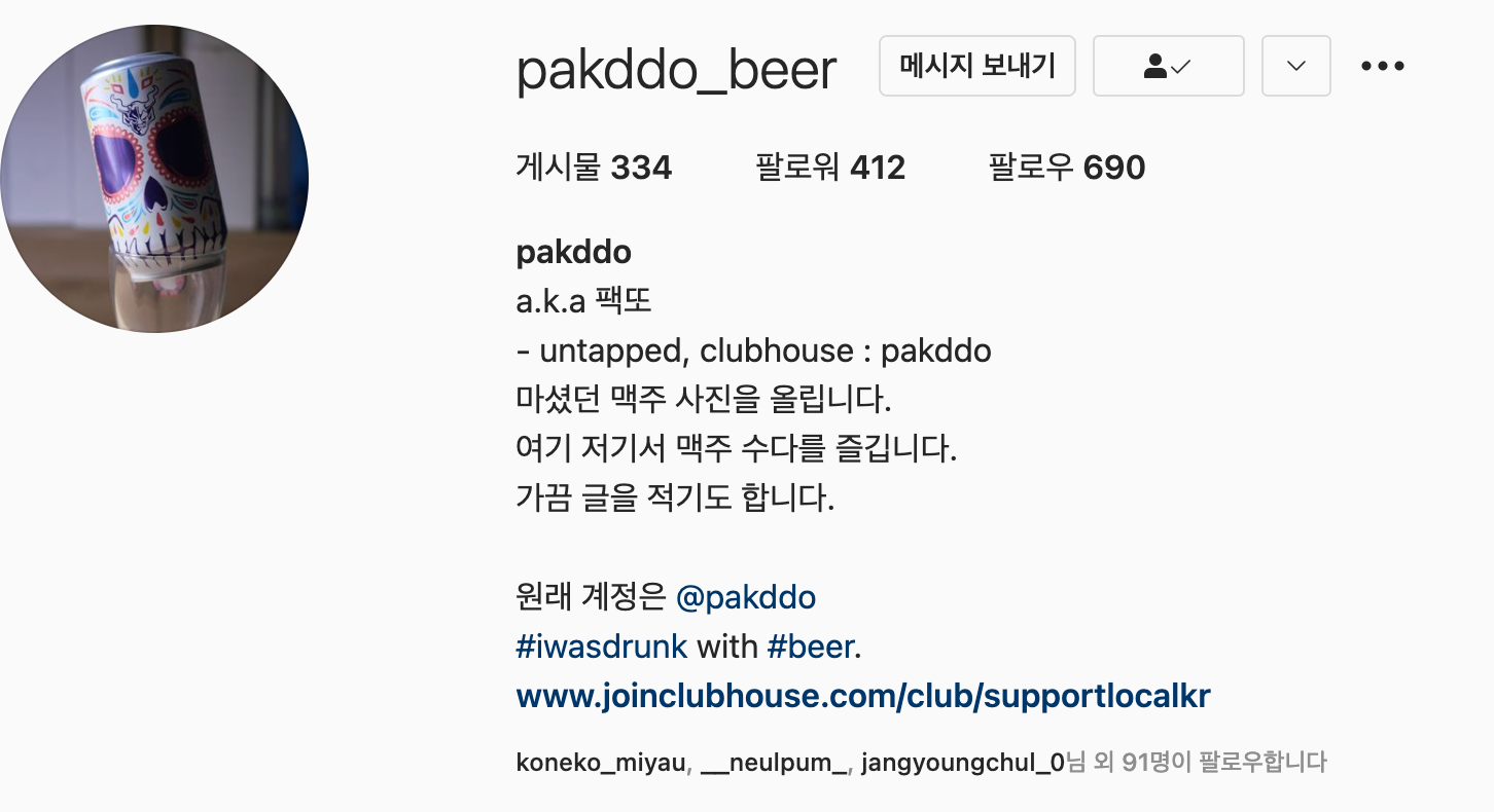 - 재택을 하고 회식도 없고 밖엘 잘 못 다니니 맥주를 사다가 집에서 열심히 먹기 시작했다. 여기저기 오픈 채팅방에서 활동하기도 했고, 본격적으로 마시기 시작하면서 맥주 인스타그램 계정을 따로 만들었다.